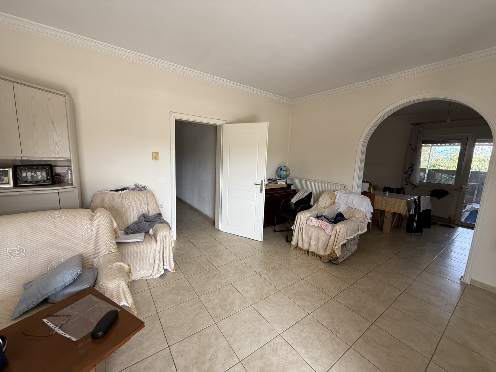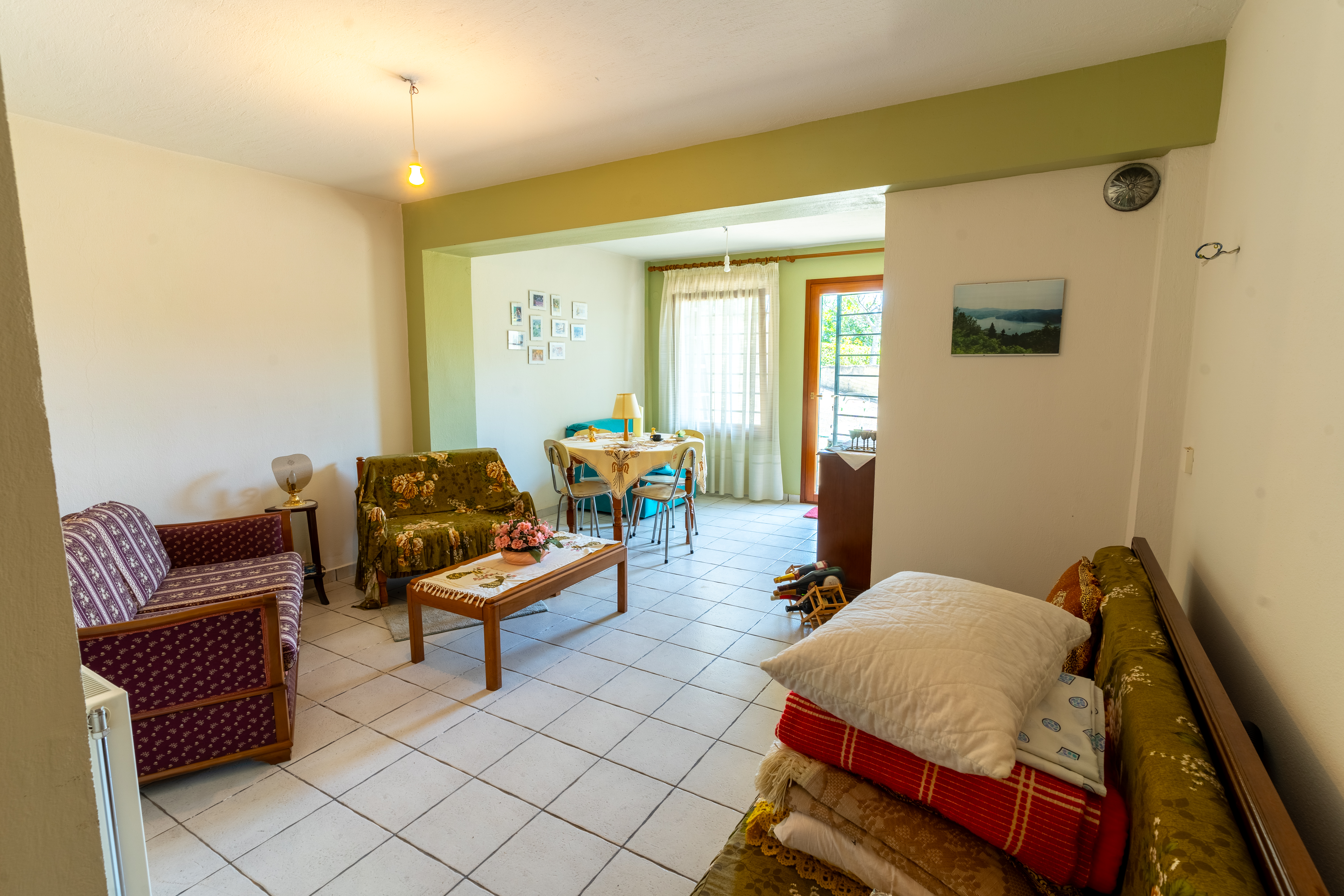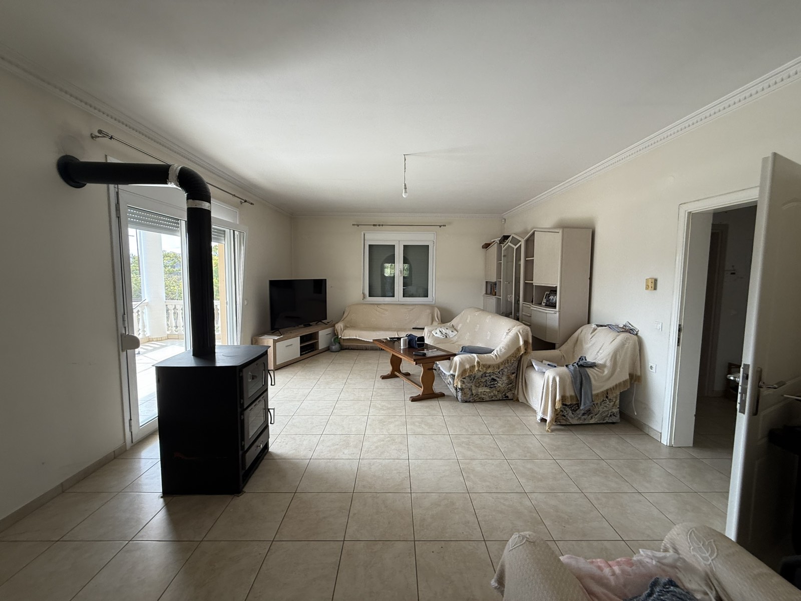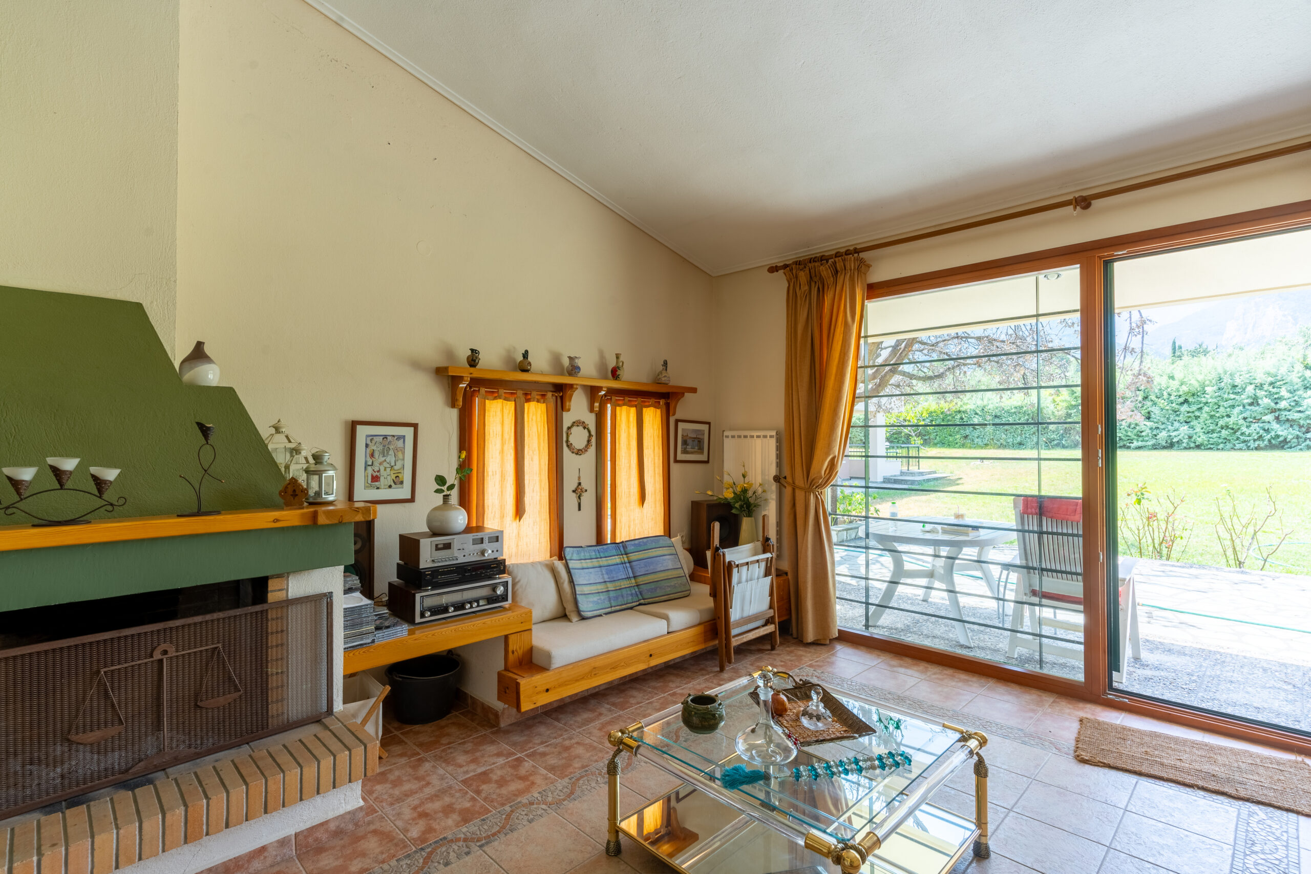 Großzügiger Wohn- und Essbereich mit imposantem Kamin, Küche, zwei Schlafzimmer, Badezimmer sowie Zugang zur vollständig gepflasterten Terrasse – ideal für Frühstück mit Blick auf die Gipfel des Olymp.
