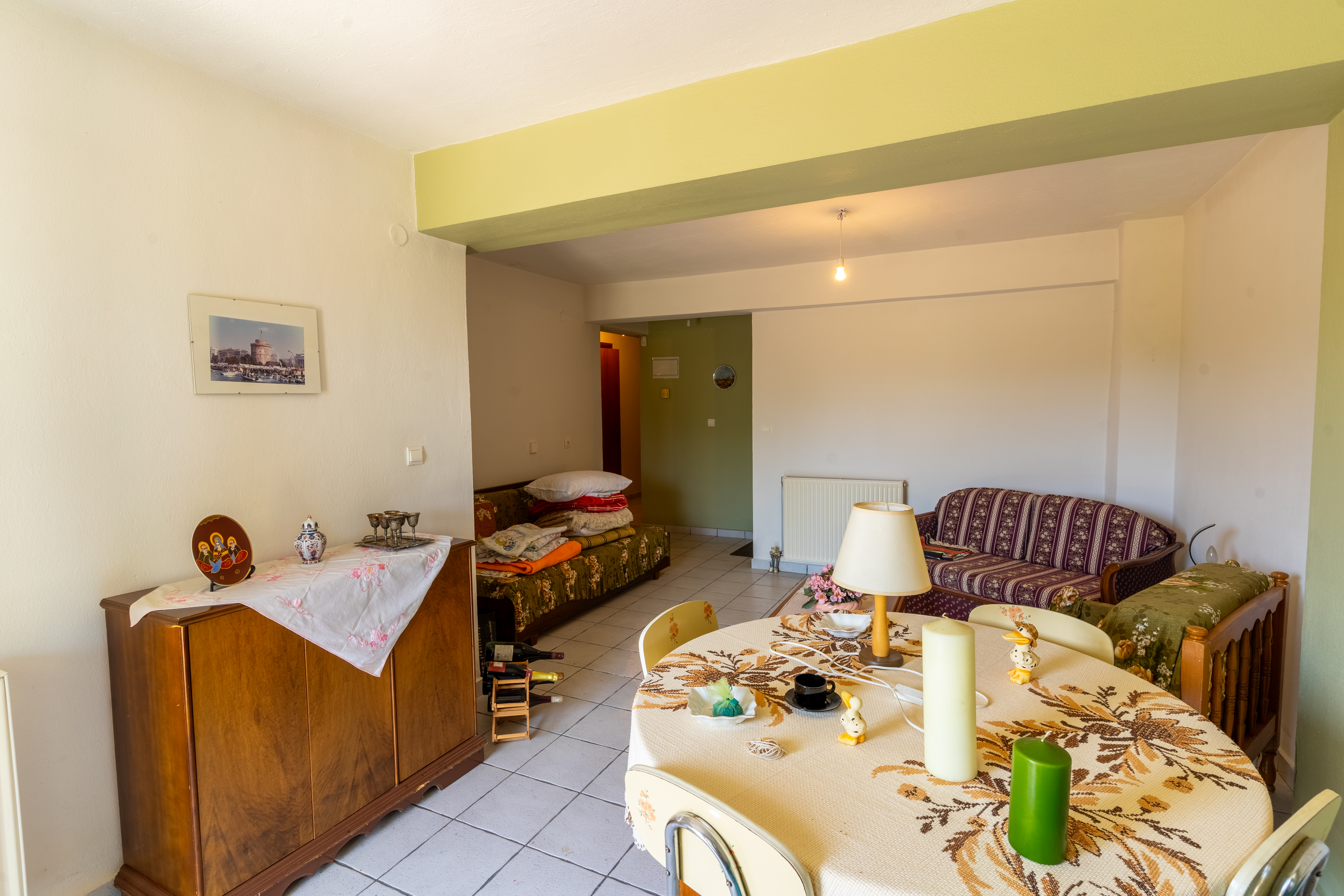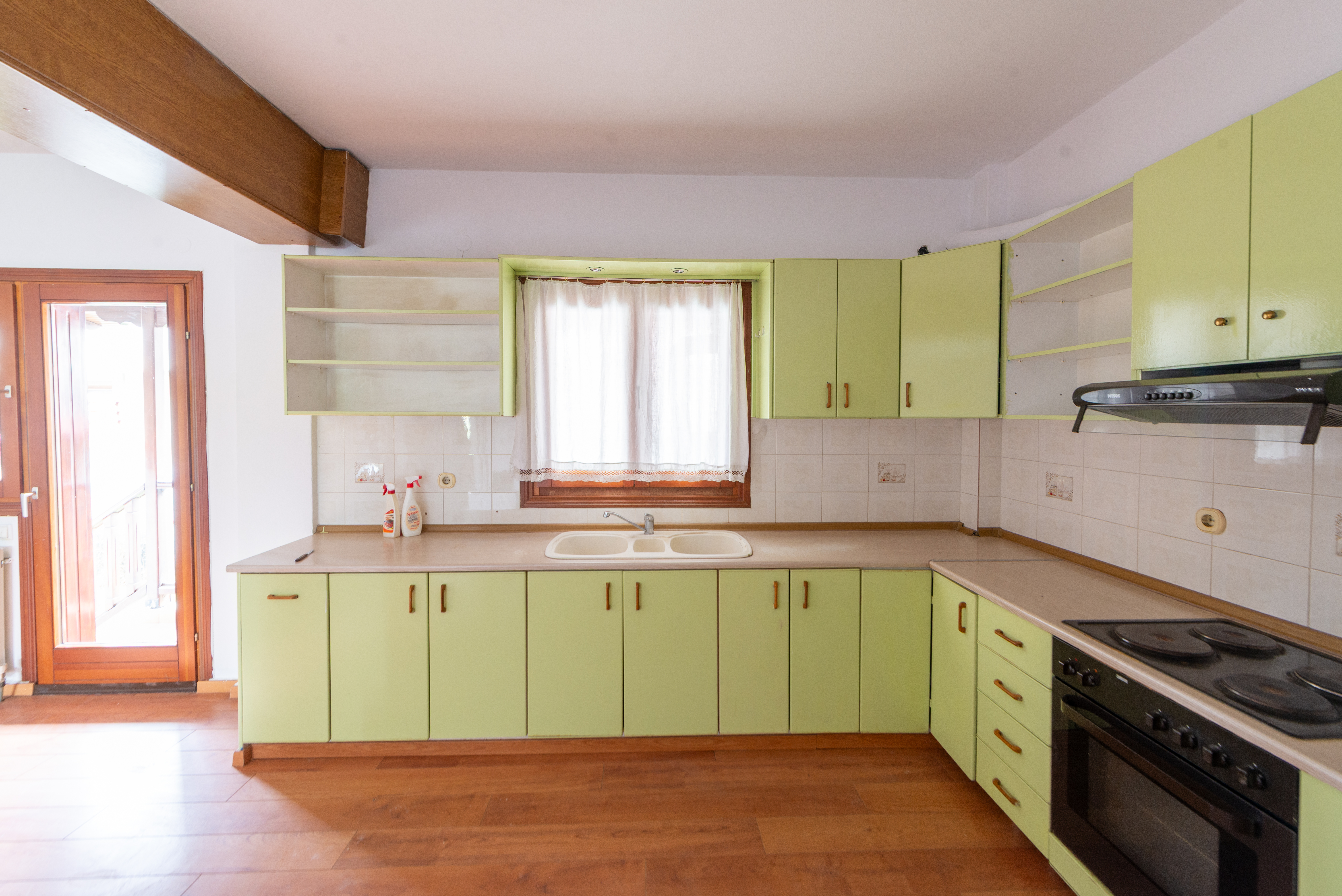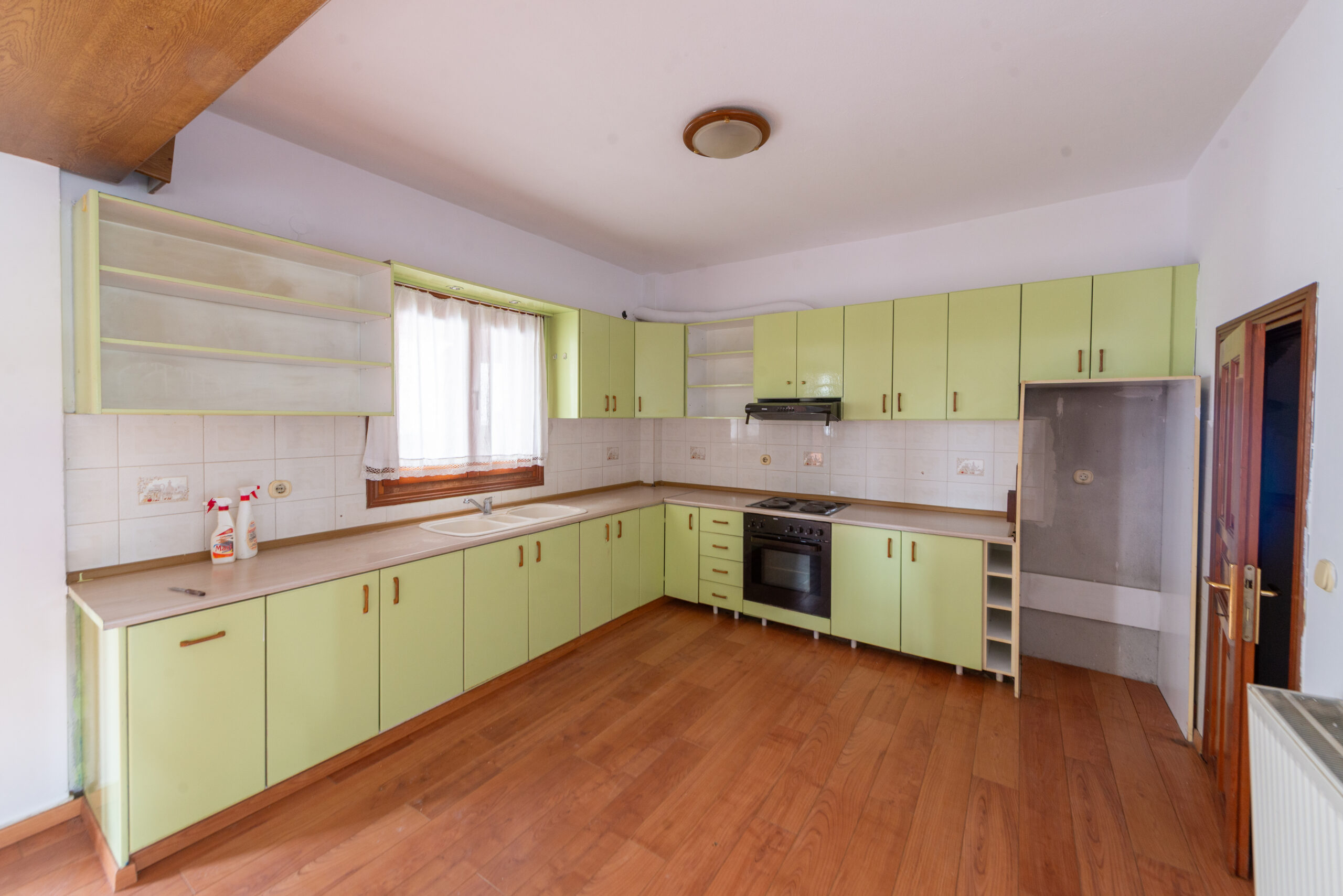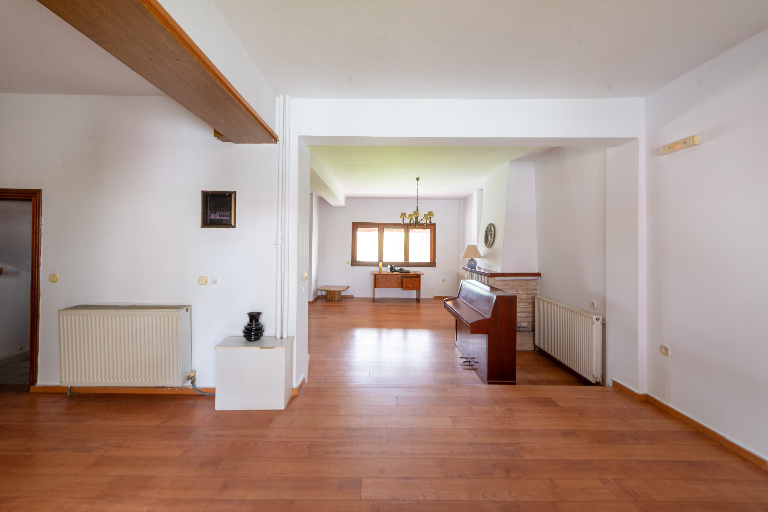 Großzügiger Wohn- und Essbereich mit imposantem Kamin, Küche, zwei Schlafzimmer, Badezimmer sowie Zugang zur vollständig gepflasterten Terrasse – ideal für Frühstück mit Blick auf die Gipfel des Olymp.